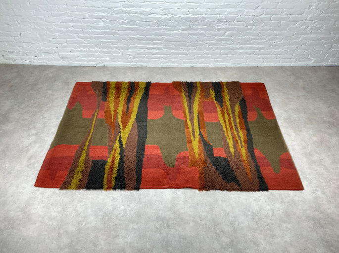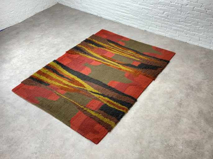 Bring a touch of 1970s nostalgia to your space with this vintage shaggy rug. A true midcentury modern piece, it features an abstract design in warm earthy tones of red, brown, and ochre. Its high- and low-pile woolen texture adds depth and character, making it a perfect choice for both retro and modern interiors.